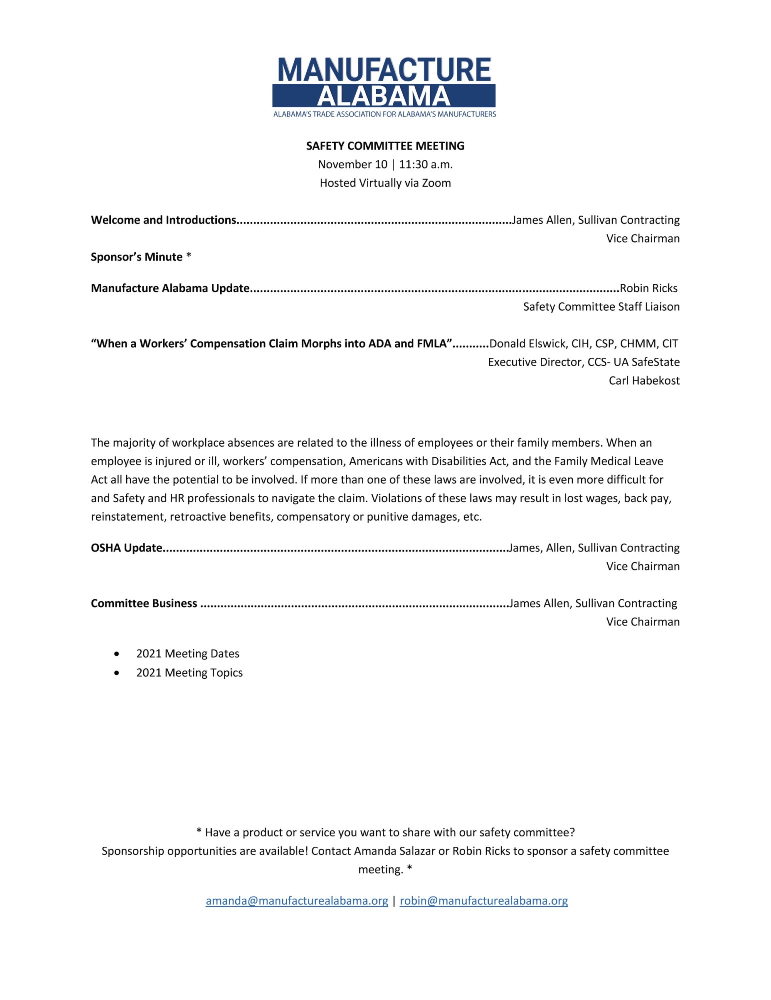 DESCRIPTION:Join the Manufacture Alabama Safety Committee on November 10 for a virtual meeting. Zoom Link will be sent after registration.